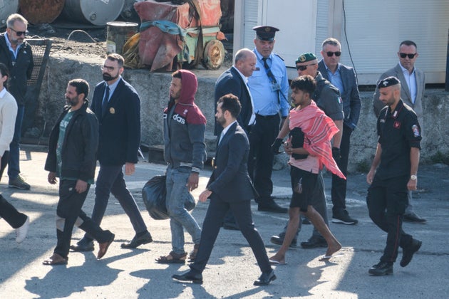 Μετανάστης συνοδεύεται από ανθρώπους του ιταλικού Πολεμικού Ναυτικού.Εκεί, θα εγκατασταθούν επίσης σε προκατασκευασμένα κτίρια, φυλασσόμενα από ιταλικές δυνάμεις της τάξης, όπου θα καταθέσουν το αίτημά τους για παροχή ασύλου. Αν το αίτημά τους απορριφθεί, θα παραμείνουν στο κέντρο μέχρι να απελαθούν στις χώρες καταγωγής τους.
