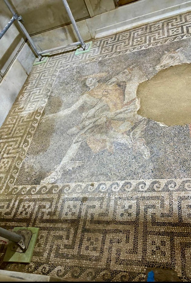 Αφαιρέθηκαν τα ικριώματα από το χώρο με το ψηφιδωτό της Αρπαγής της Περσεφόνης και ολοκληρώνεται ο καθαρισμός του ψηφιδωτού.