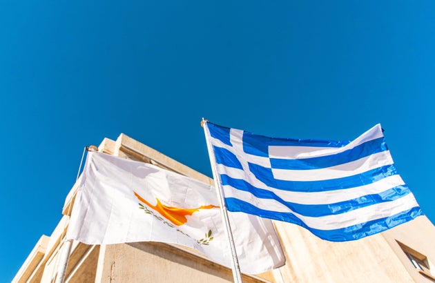 Cypriot and Greek flags flying against blue sky in Paphos, Cyprus – September, 2023