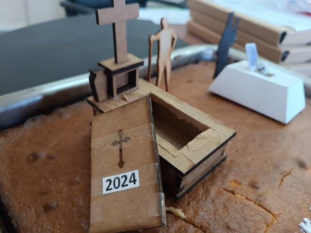 Οπως θα δείτε και στις φωτογραφίες, η διακόσμηση του κέικ είχε τάφους, σκελετούς, νεκροθάφτη, ιερέα, ενώ ο/η δημιουργός της «έθαψε» το 2024.