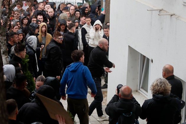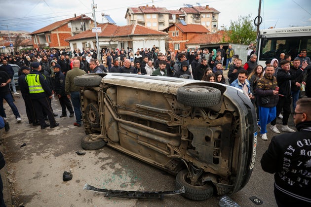 Άνθρωποι προσπαθούν να αναποδογυρίσουν ένα αμάξι, ενώ διαμαρτύρονται κοντά στο σπίτι του ιδιοκτήτη ενός νυχτερινού κέντρου που ήταν ο τόπος μαζικής πυρκαγιάς, μετά από μια ολονυκτία για τα θύματα στην πόλη Κοτσάνι, Βόρεια Μακεδονία, Δευτέρα 17 Μαρτίου 2025. (AP Photo/Armin Durgut)Μεγάλος αριθμός πολιτών της πόλης Κότσανι στη Βόρεια Μακεδονία συγκεντρώθηκε τη Δευτέρα στο δημαρχείο και απαίτησε δικαιοσύνη για τα θύματα της φονικής πυρκαγιάς στη ντίσκο “Pulse”.