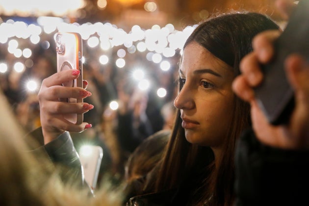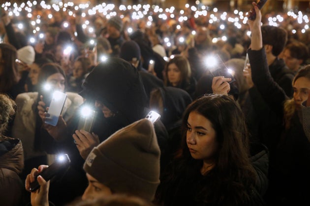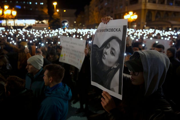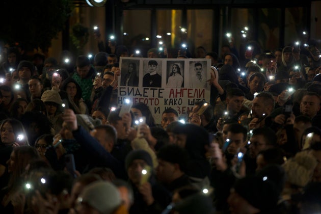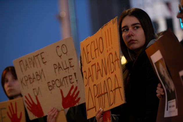 Διαδηλωτές κρατούν πλακάτ καθώς χιλιάδες άνθρωποι συγκεντρώνονται για να διαμαρτυρηθούν για τα θύματα της μεγάλης πυρκαγιάς σε νυχτερινό κέντρο στην πόλη Κοτσάνι, στα Σκόπια της Βόρειας Μακεδονίας, Τρίτη 18 Μαρτίου 2025. (AP Photo/Visar Kryeziu)Χιλιάδες πολίτες όλων των ηλικιών πραγματοποίησαν συγκέντρωση διαμαρτυρίας στα Σκόπια, την πρωτεύουσα της Βόρειας Μακεδονίας, καθώς η χώρα βρίσκεται αντιμέτωπη με τη μεγαλύτερη τραγωδία στην ιστορία της.