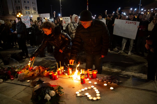 Άνθρωποι ανάβουν κεριά κατά τη διάρκεια αγρυπνίας στην πόλη Κοτσάνι της Βόρειας Μακεδονίας, την Τρίτη 18 Μαρτίου 2025, μετά την τεράστια πυρκαγιά που ξέσπασε σε νυχτερινό κέντρο διασκέδασης τα ξημερώματα της Δευτέρας. (AP Photo/Armin Durgut)