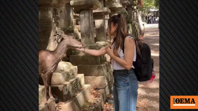 Ένα ελάφι χάιδεψε στην Ιαπωνία η Αποστολία Ζώη και συγκινήθηκε καθώς εκείνο έσκυψε ξανά το κεφάλι του για να συνεχίσει να το χαϊδεύει.