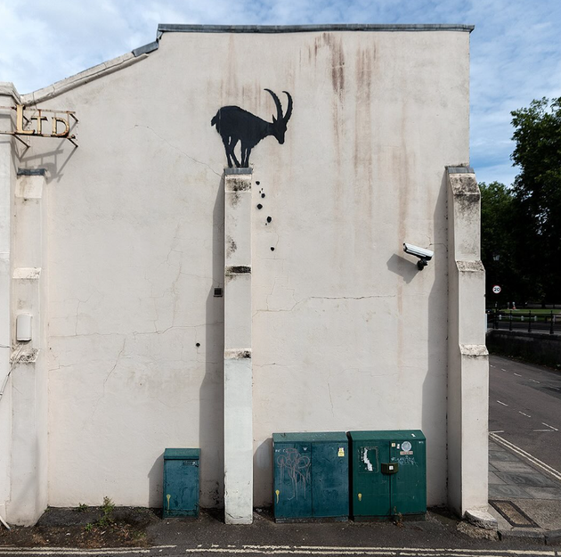 Το στένσιλ που εμφανίστηκε στον τοίχο ενός κτιρίου κοντά στη γέφυρα Kew στο Ρίτσμοντ, στο νοτιοδυτικό Λονδίνο, απεικονίζει την κατσίκα να ισορροπεί σε μια άκρη, κομμάτια βράχων να πέφτουν, ενώ στη φωτογραφία φαίνεται και μια κάμερα κλειστού κυκλώματος στραμμένη προς το μέρος της (η κάμερα έχει εντωμεταξύ μετακινηθεί).