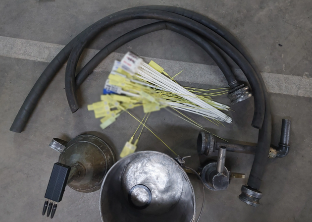Από τις έρευνες που διενεργήθηκαν σε οικίες και σε άλλους χώρους, παρουσία εκπροσώπου Δικαστικής Αρχής, με τη συνδρομή της Ελεγκτικής Υπηρεσίας Τελωνείου Θεσσαλονίκης, βρέθηκε και κατασχέθηκε το ποσό των 8.600 ευρώ, πλαστικά δοχεία, διάφορα αντικείμενα που χρησιμοποιούνται για την παράνομη εκφόρτωση καυσίμου, αυτοσχέδια μεταλλική κατασκευή (τύπου βρυσάκι) που ήταν δυνατόν να «κουμπώσει» σε στόμιο δεξαμενής καυσίμων του βυτιοφόρου οχήματος, πλήθος αριθμημένων σφραγίδων, παρεμβολέας ραδιοσυχνοτήτων και αυτοκίνητο.