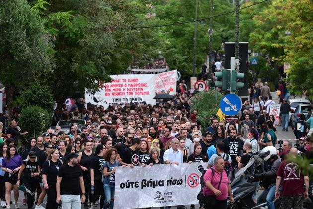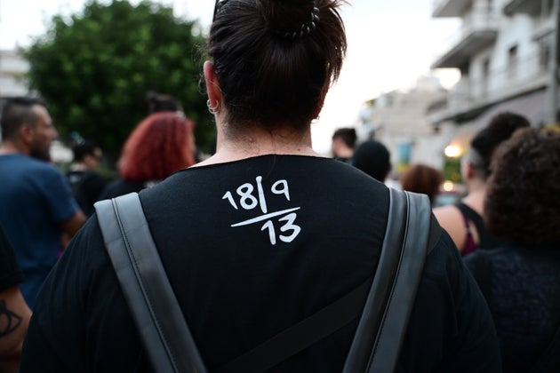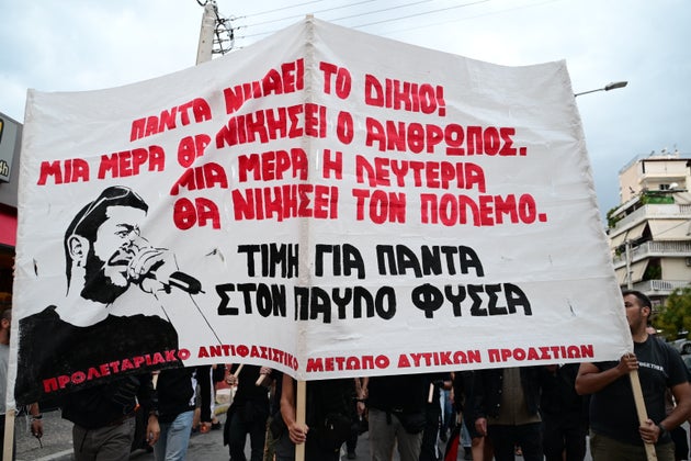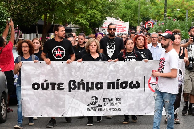 «Ούτε βήμα πίσω», γράφει το πανό που βρίσκεται στην κορυφή της πορείας, το οποίο κρατά η μητέρα του Παύλου, Μάγδα Φύσσα.