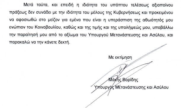 «Ανακοινώνεται ότι ο Υπουργός Μετανάστευσης και Ασύλου Μάκης Βορίδης υπέβαλε την παραίτησή του στον Πρωθυπουργό, για τους λόγους που αναφέρονται στην επιστολή και η οποία επισυνάπτεται. Ο Πρωθυπουργός έκανε δεκτή την παραίτησή του.