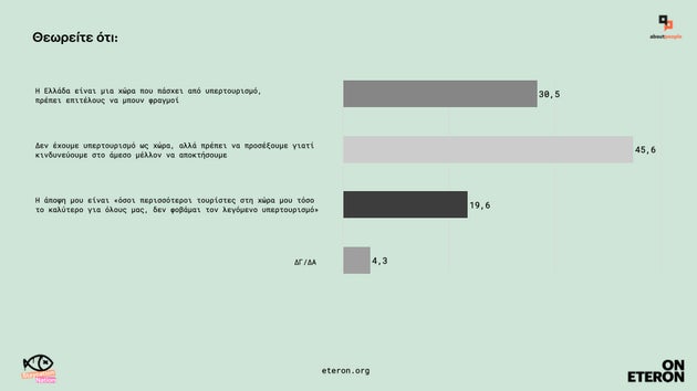 Πάντως, έρευνες γίνονται, όπως μια τελευταία του Ινστιτούτου Eteron που διενεργήθηκε από την aboutpeople, και η οποία κατέγραψε τις απόψεις των Ελλήνων σχετικά με την επίδραση του τουρισμού και το φαινόμενο του υπερτουρισμού. Η έρευνα πραγματοποιήθηκε διαδικτυακά από τις 22 έως τις 24 Ιουλίου 2024, σε δείγμα 1.002 ανδρών και γυναικών ηλικίας 17 ετών και άνω με πανελλαδική κάλυψη.