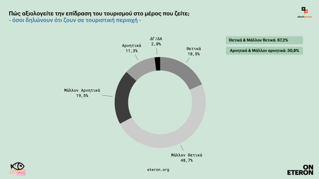 Επίσης, στην ερώτηση πώς αξιολογείτε την επίδραση του τουρισμού στο μέρος που ζείτε, όσοι δηλώνουν ότι ζουν σε τουριστική περιοχή απάντησαν «θετικά – μάλλον θετικά» το 67,2% (71,4% άνδρες και 63,1% γυναίκες) και «αρνητικά – μάλλον αρνητικά» το 30,8% (28,6% άνδρες και 33,0% γυναίκες).