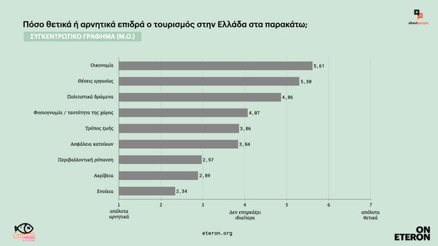 Οι ερωτηθέντες που ζουν σε τουριστικές περιοχές αξιολόγησαν την επίδραση του τουρισμού στην περιοχή τους, με το 67,2% να θεωρεί την επίδραση θετική ή μάλλον θετική, ενώ το 30,8% τη χαρακτηρίζει ως αρνητική ή μάλλον αρνητική. Σε εθνικό επίπεδο, το 74,4% αξιολόγησε την επίδραση του τουρισμού στην Ελλάδα θετικά ή μάλλον θετικά, ενώ το 24,4% έχει αντίθετη άποψη.
