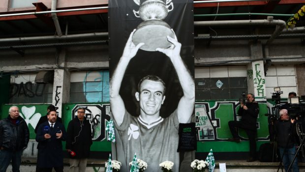 Η κόρη του Μίμη Δομάζου, Πόπη, συνόδευσε στο γήπεδο της Λεωφόρου την σορό του πατέρα της, πριν από την έκθεση της σε λαϊκό προσκύνημα στη Μητρόπολη Αθηνών.