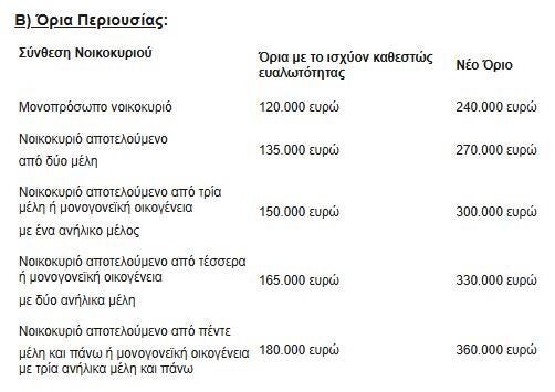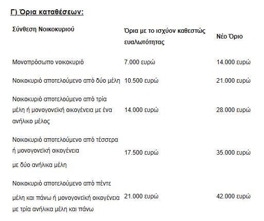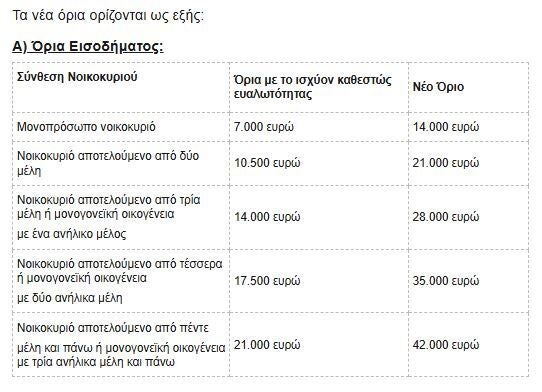 - Αύξηση των εισοδηματικών και περιουσιακών ορίων προκειμένου να χαρακτηριστεί ένας οφειλέτης ως επιλέξιμος στο πλαίσιο της υποχρεωτικής αποδοχής του εξωδικαστικού μηχανισμού από τους πιστωτές. Με τη ρύθμιση που εισάγεται, διπλασιάζονταιτα κριτήρια για το χαρακτηρισμό δανειολήπτη ως επιλέξιμου προκειμένου να καταστεί υποχρεωτική η συναίνεση του συνόλου των πιστωτών για ένταξη του οφειλέτη στον εξωδικαστικό μηχανισμό. Ο διπλασιασμός των ορίων αυτών έχει ως προϋπόθεση ο οφειλέτης να έχει ανώτατο όριο ήδη μη εξυπηρετούμενων τραπεζικών οφειλών (δηλαδή σε τράπεζες ή servicers) τις 000 ευρώ.