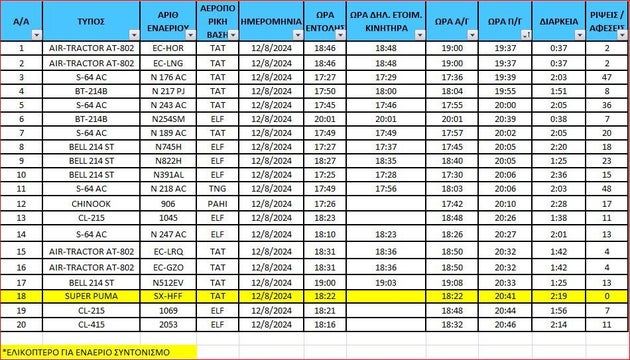 - Στις 12 Αυγούστου: 36 εναέρια μέσα (17 αεροσκάφη και 19 ελικόπτερα)